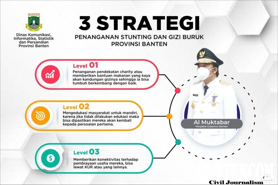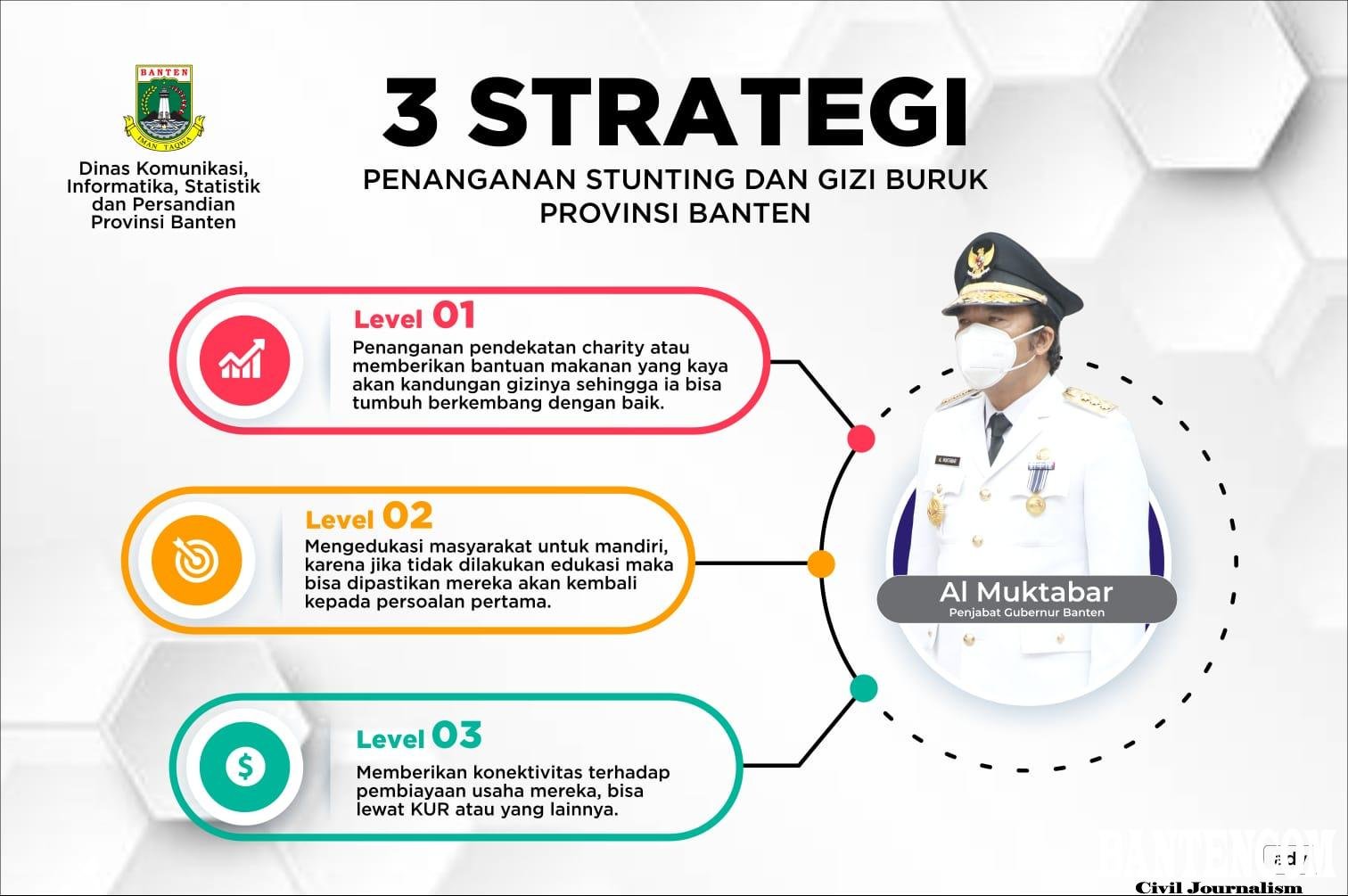Ada tiga strategi dilakukan Penjabat (Pj) Gubernur Banten Al Muktabar, yang juga menjabat sebagai Ketua Pelaksana Tim Percepatan Penurunan Stunting (TPPS) Provinsi Banten, yaitu Pertama Penangan pendekatan charity atau memberikan bantuan makanan yang kaya akan kandungan gizinya, sehingga ia bisa tumbuh berkembang dengan baik; Kedua Mengedukasi masyarakat untuk mandiri, karena jika tidak dilakukan edukasi maka bisa dipastikan mereka akan kembali kepada persoalan pertama; Ketiga memberikan konektivitas terhadap pembiayaan usaha mereka, bisa lewat KUR atau yang lainnya.