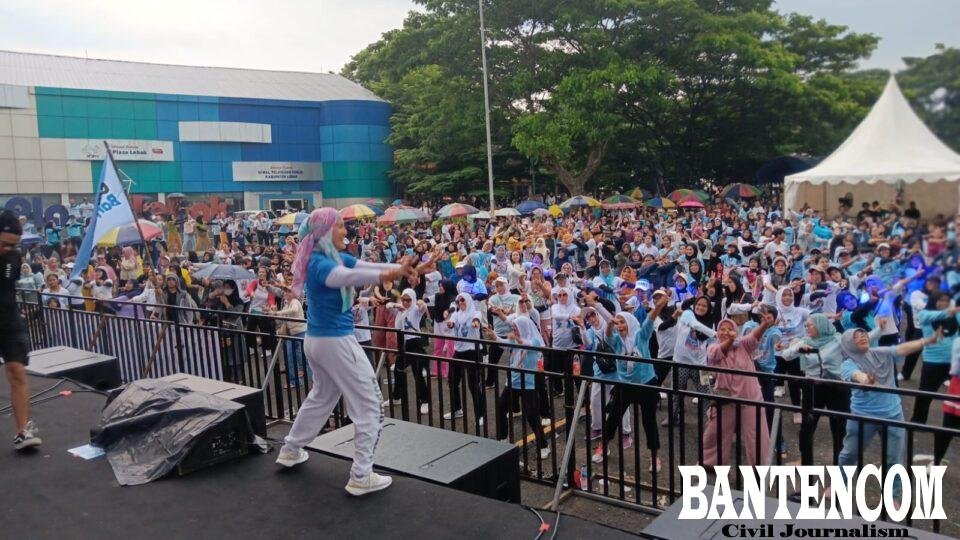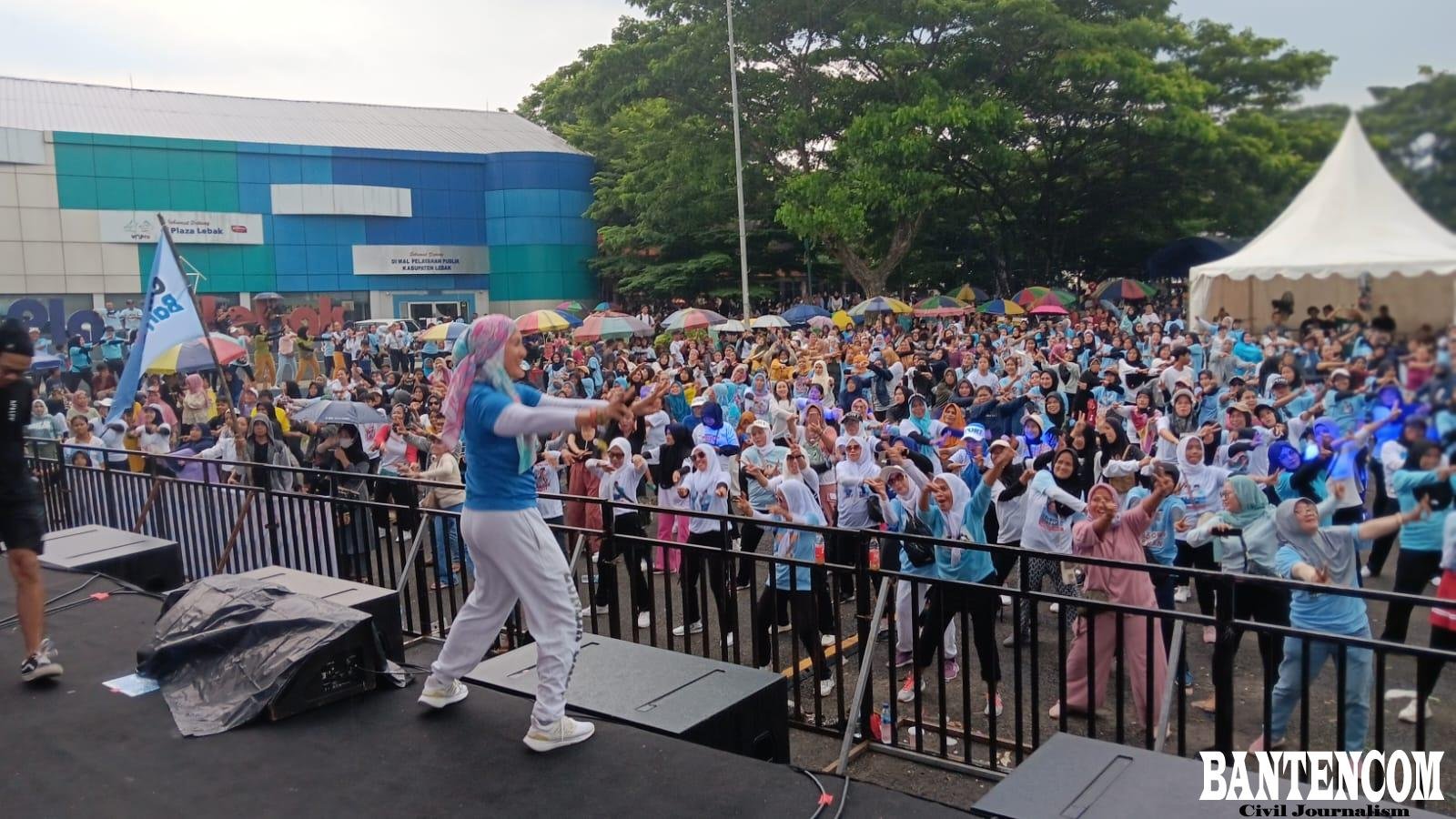 Ribuan peserta senam gemoy memadati kawasan Plaza Lebak, Banten, Jumat sore 9 Februari 2024. Para peserta tampak antusias mengikuti acara rangkaian Konser Indonesia Maju Gerakan Banten Nyata menutup kegiatan akhir penghujung masa kampanye Prabowo Gibran. Mass tampak tetap semangat walau sempat dihuyur hujan lebat.